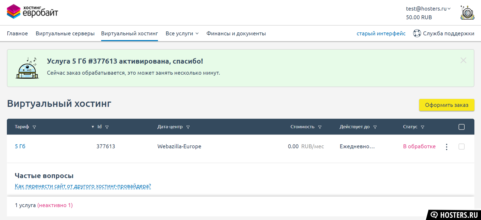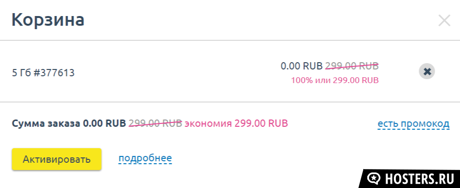 Нетрадиционный подход к предоставлению тестового периода - это то, что объединяет хостинг с Макхост - тестовый аккаунт будет активирован после пополнения аккаунта (эта сумма не будет тратиться, по истечению теста вы сможете использовать внесенные деньги на оплату услуг).Активируется несколько заморочено - после регистрации вы пополняете счет на 50 рублей (при этом нельзя удалять неоплаченную услугу из корзины). После пополнения надо перейти в корзину, и вы увидите, что стоимость заказа стала 0 рублей, надо нажать "активировать".