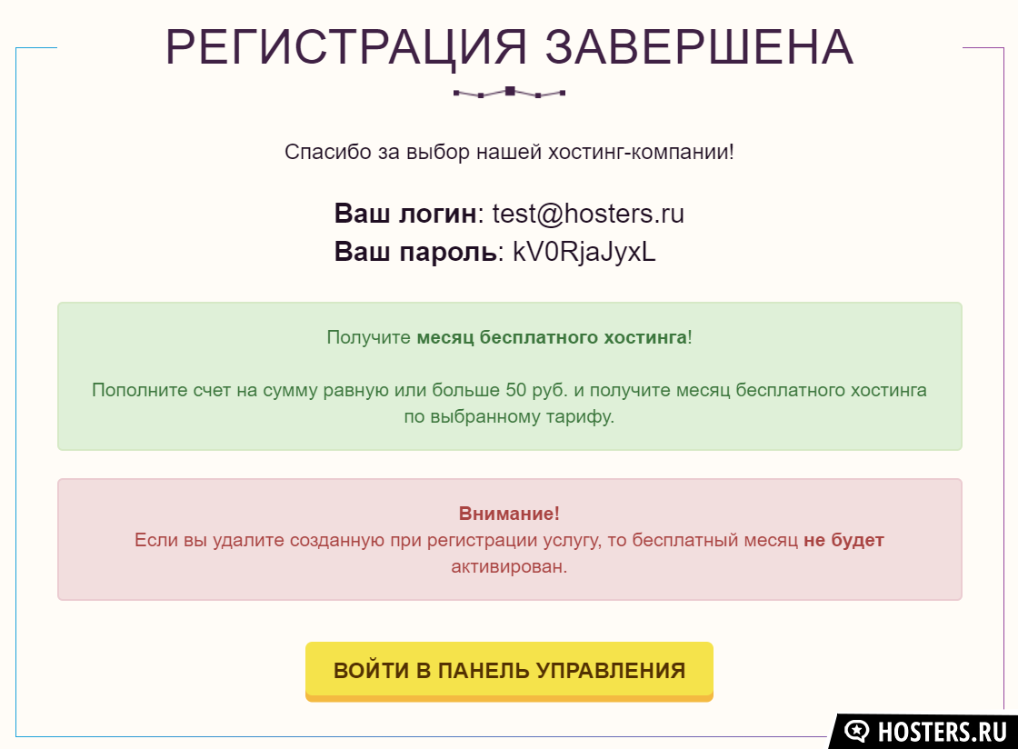Регистрация простейшая - ввести e-mail, выбрать тариф и указать расположение сервера (Москва или Амстердам). Все. Не нужно даже проверять почту - все учетные данные отобразятся на экране, можно сразу войти в панель управления и начать настраивать аккаунт.