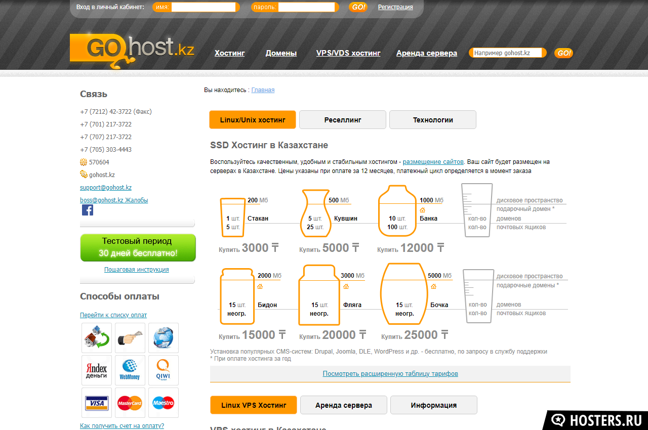У GOhost.kz доступен выбор среди 4 VDS-тарифов. Помимо ОС сервера на базе ядра Linux, есть возможность заказать VPS под FreeBSD (виртуализация KVM). Трафик без ограничений. Подробнее о тарифах →