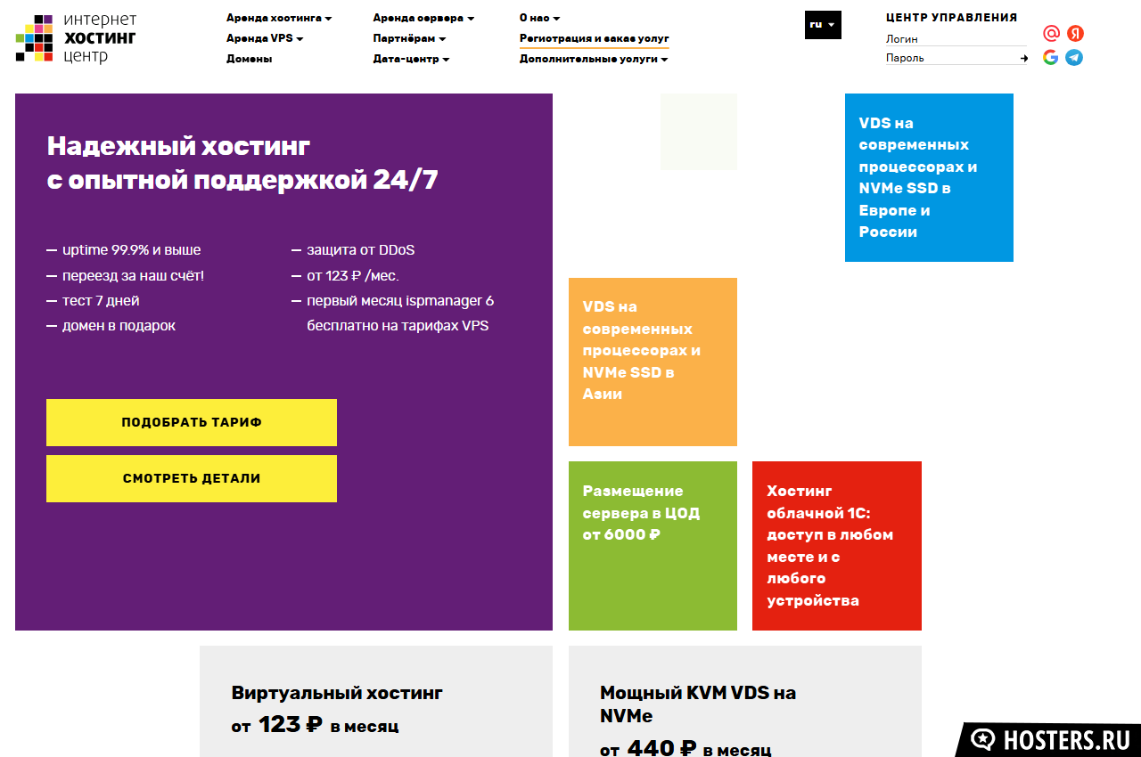 Для удобного управления виртуальным сервером компания предлагает ISPmanager (Light-версия от 300₽ в месяц). Интернет Хостинг Центр предоставляет пользователям бесплатную панель на всех тарифах.Полезное