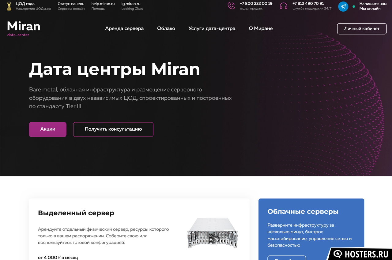 Миран (miran.ru) предлагает на выбор более десяти конфигураций серверов (dedicated) на процессорах Intel и AMD. Администрирование оборудования специалистами хостинг-провайдера платное. Стоимость зависит от сложности работ. Если вы решите досрочно прекратить пользоваться купленным оборудованием, хостинг обещает вернуть неиспользованный остаток по счету.
