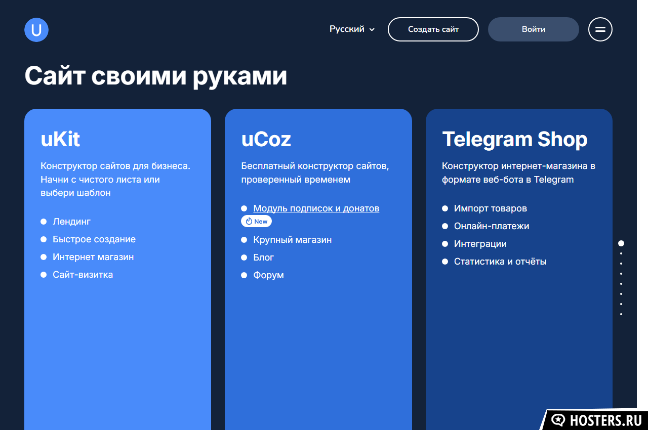Однако UCoz – это не только хостинг, но еще и масштабный конструктор сайтов, который располагает 300 шаблонами (не самыми крутыми, но некоторые выглядят вполне сносно) и тремя целевыми сервисами: